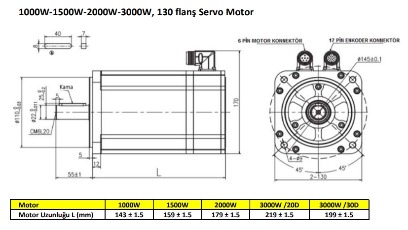 The 1000W servo motor, with a 130mm flange connection, 22mm shaft diameter, and a 4.8Nm torque capacity, offers exceptional performance. Thanks to its 20-bit Nikon encoder, it provides precise speed, position, and torque control. It is an effective and reliable solution for test devices, presses, cutting, filling, packaging, plastic, and food machinery.
