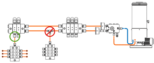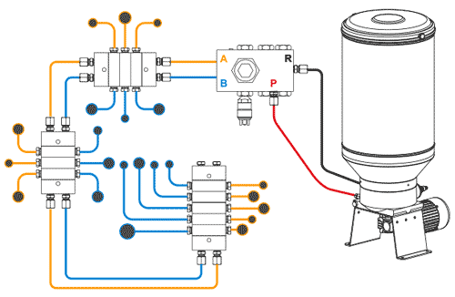 Progressive distributors must be connected to two -line system distributors.In this way, the entire oil in the main lines will be able to feed 2 -line system distributors.