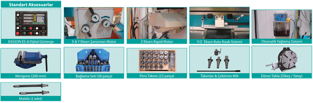 Digital indicator, X & Y axis transmission motor, Z axis rapid motor, Y/Z axis box slide system, automatic lubrication system, vice, clamping set, collet set, tools & drawbar, mandrel, rotary table.