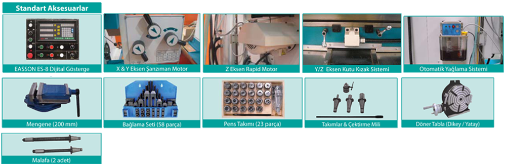 Digital indicator, X & Y axis transmission motor, Z axis rapid motor, Y/Z axis box slide system, automatic lubrication system, vice, clamping set, collet set, tools & drawbar, mandrel, rotary table.