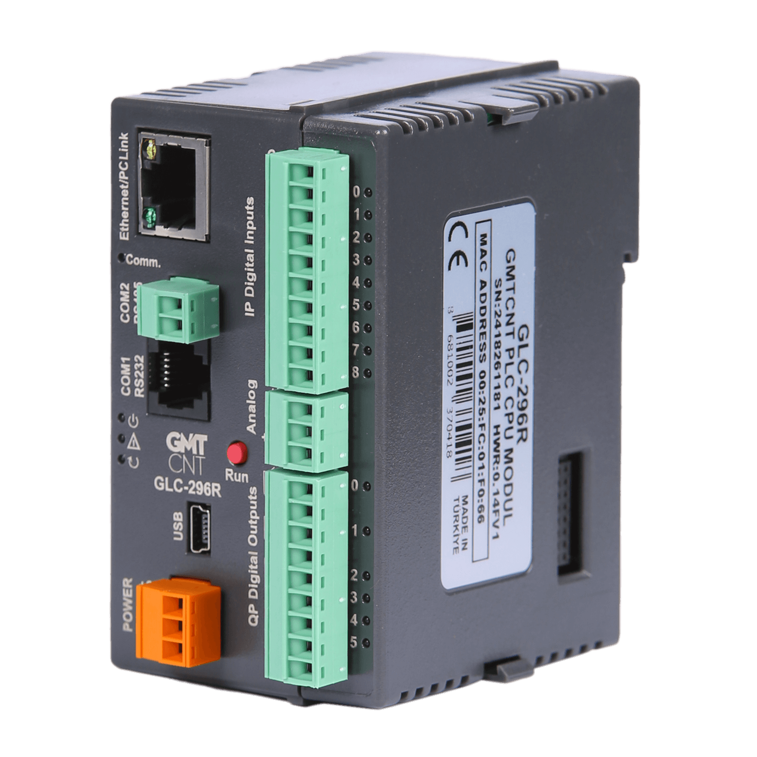 GLC-296R PLC CPU Module: 24 VDC power supply, 9 inputs, 6 relay outputs (5A), 1 analog input (12-bit), 1 analog output (14-bit), modular structure (16 expansions, 273 points), ethernet, RS232/RS485, MODBUS RTU, 196 kB memory, 20 kHz cycle, 50 kHz high-speed counter, 3 encoder connection capabilities, DIN rail mounting.