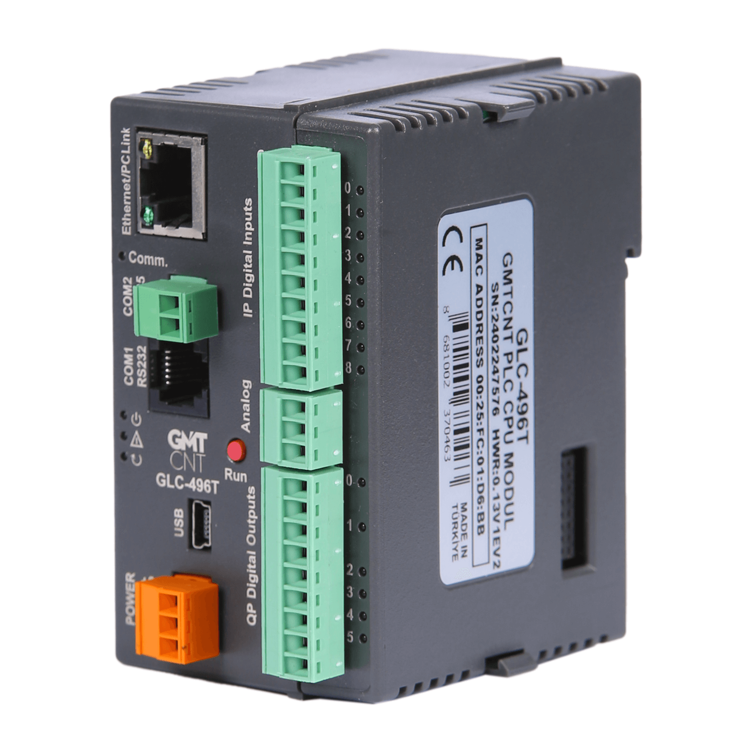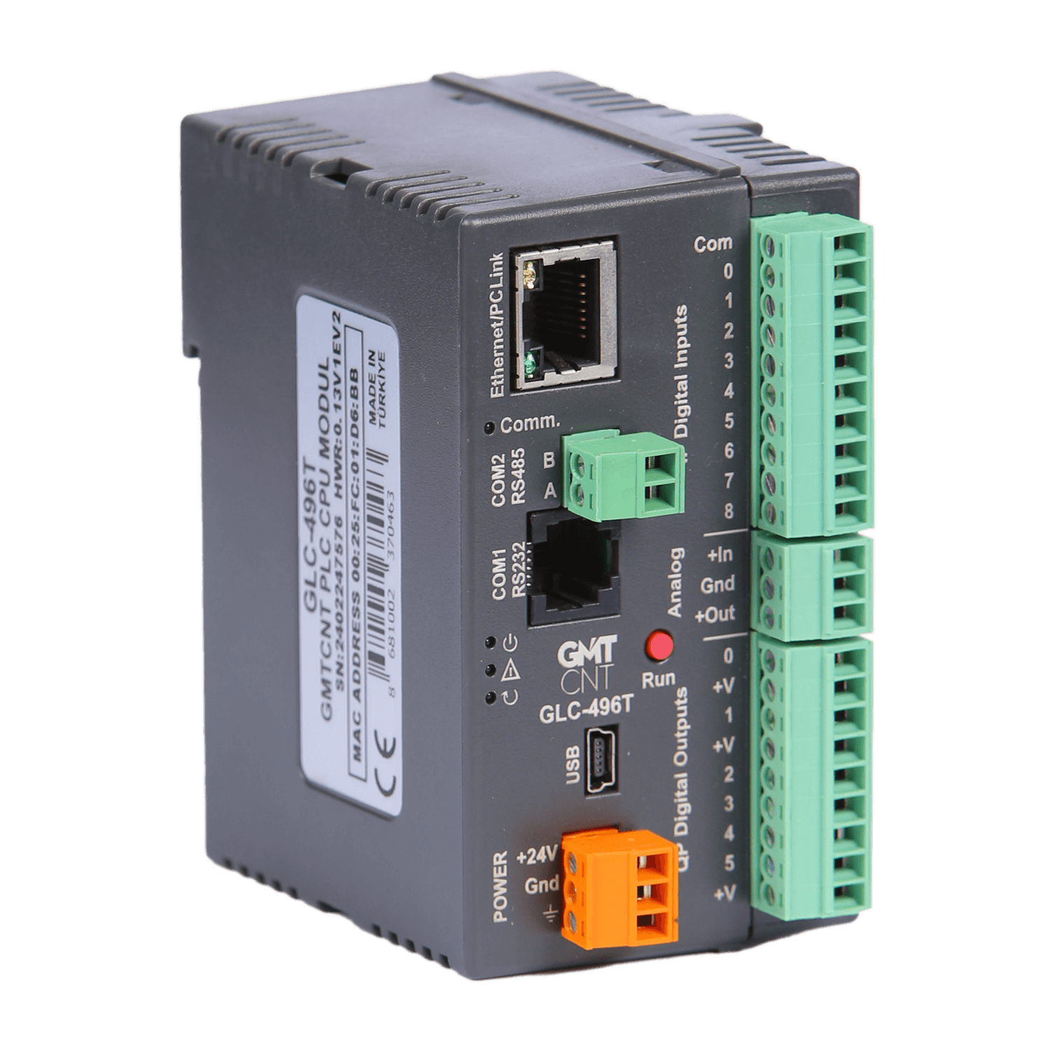 "GLC-496T PLC Module: 24 VDC, 9 inputs, 6 transistor outputs (450mA), 3x400 kHz pulse outputs, 3 encoder inputs, modular structure (273 points), ethernet, RS232/RS485, MODBUS RTU/TCP, 196 kB memory, 20 kHz cycle, analog input/output (12/14 bit), WMI, e-mail, RTC, GMT Scada, USB Datalog.