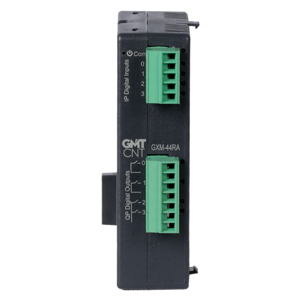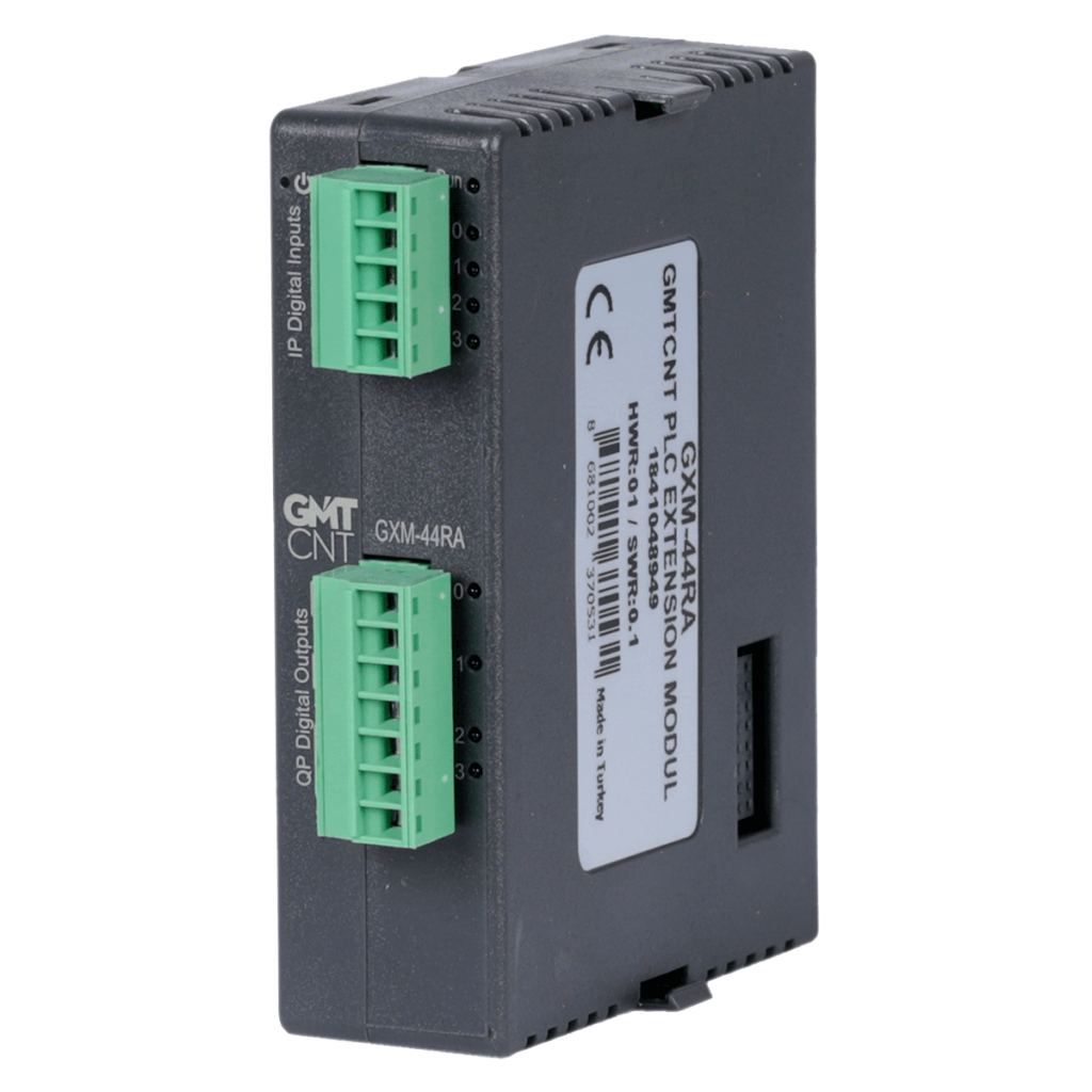 It is a PLC expansion module compatible with GMTSuite software. This module, used to increase the input/output capacity, can only work with the CPU. It has 4 channels of 24VDC isolated digital inputs (compatible with PNP and NPN) and 4 channels of 230VAC 5A relay outputs.