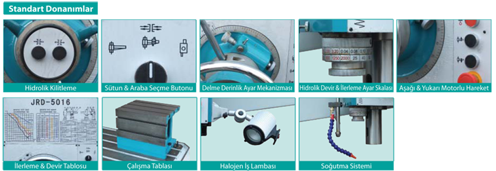 Hydraulic locking, Column & carriage selector button, Drilling depth adjustment mechanism, Hydraulic speed & feed adjustment scale, Motorized up & down movement, Feed & speed chart, Worktable, Halogen work lamp, Cooling system