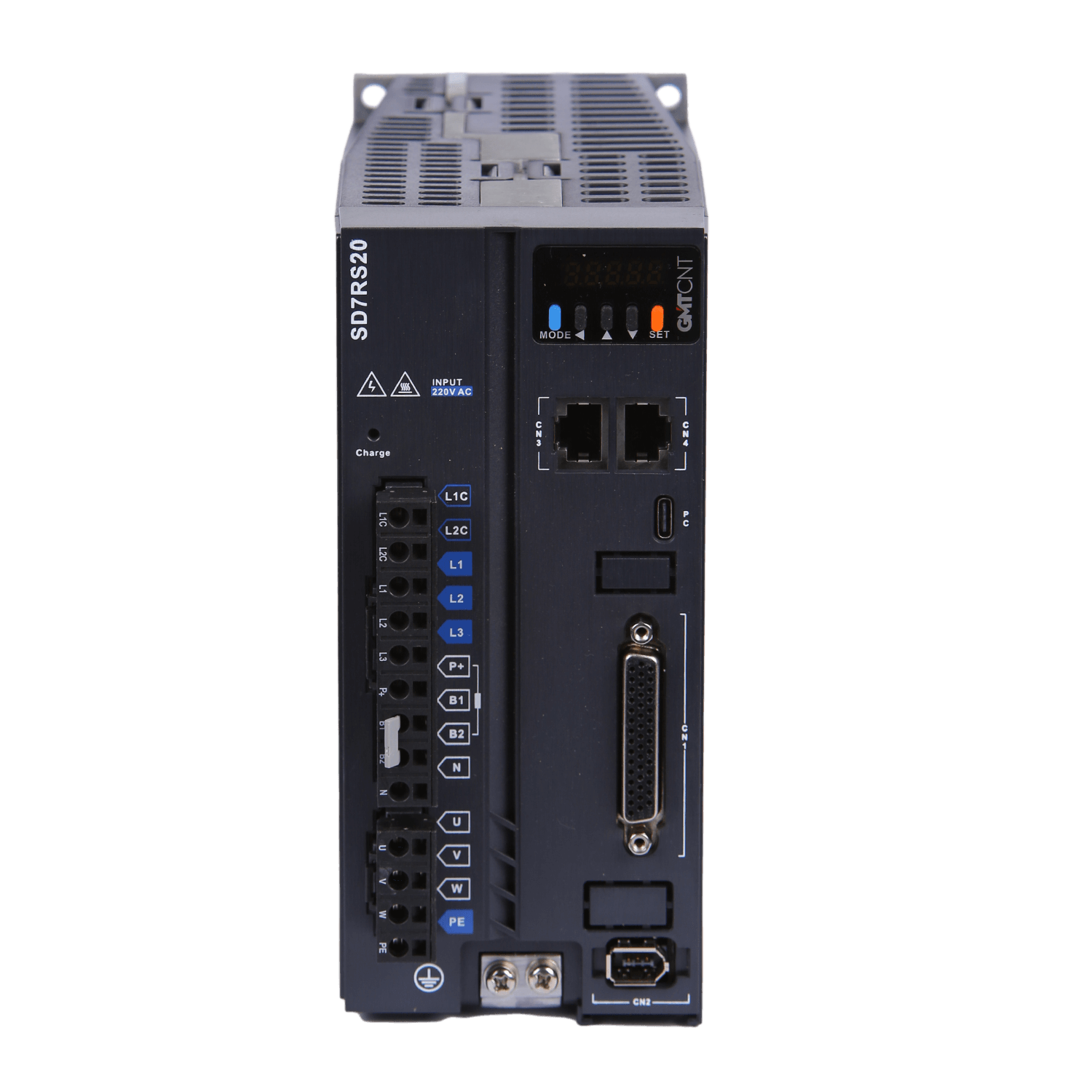 SD7RS20 servo drive offers position, speed, and torque control modes with its 2000W power and compact design. It supports 220V/380V connection, Modbus RTU/EtherCAT communication, a 23-bit encoder, USB Type-C, and internal brake resistance, making it user-friendly. With Auto Tuning, error analysis, and protection functions, it is suitable for industrial applications.