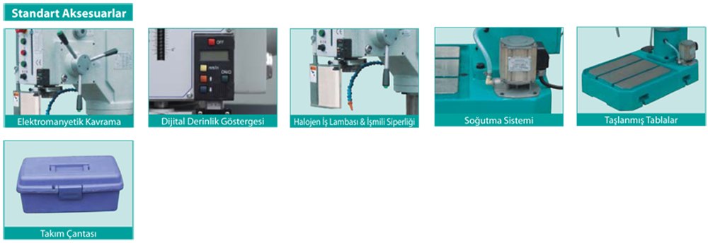 Electromagnetic chuck, Digital depth gauge, Halogen work lamp & shield, Cooling system, Ground tables, Toolbox