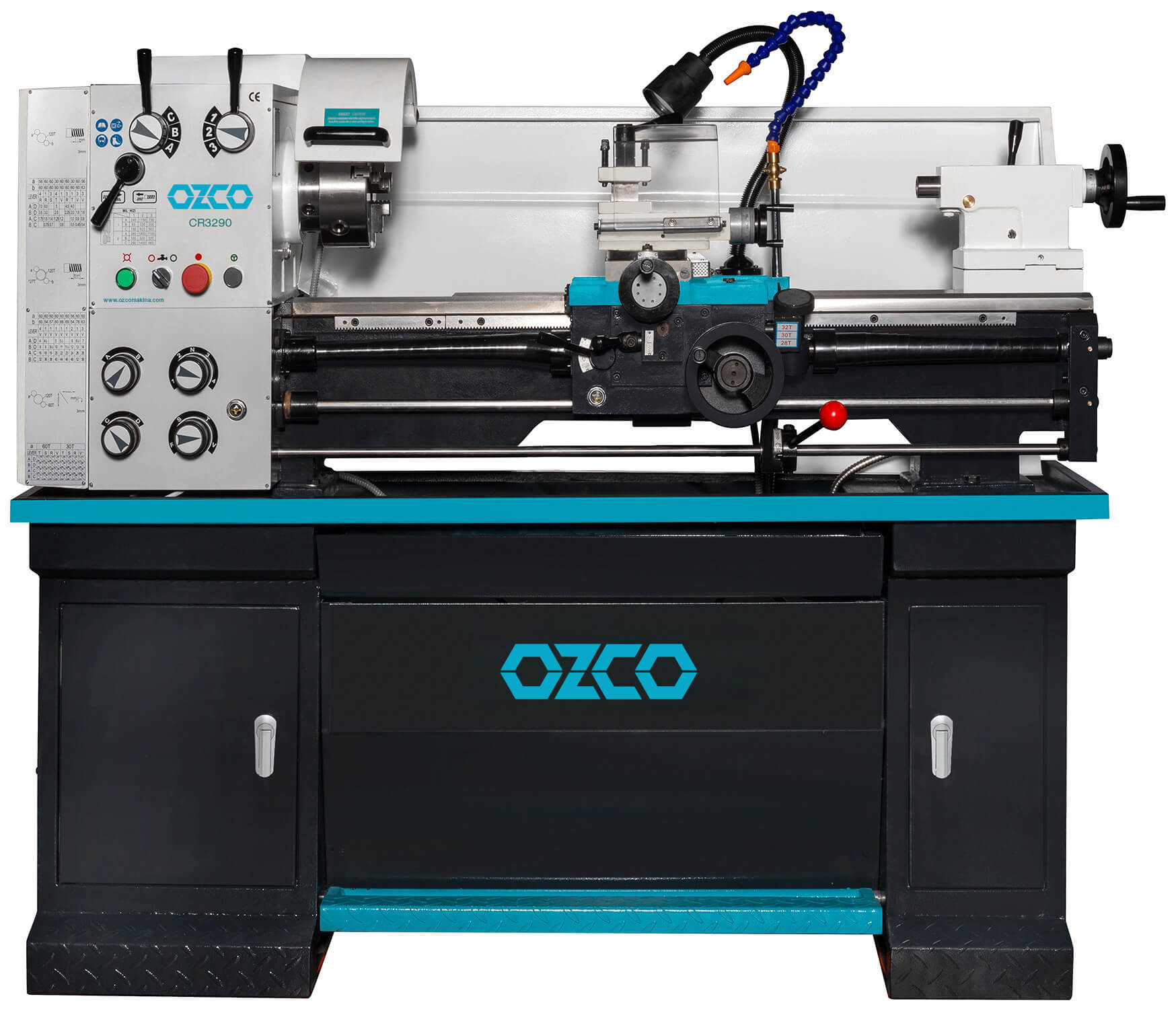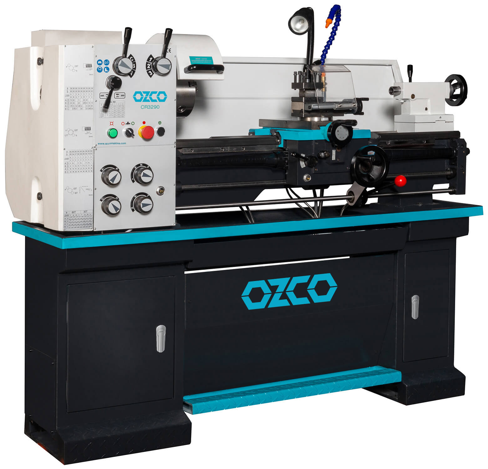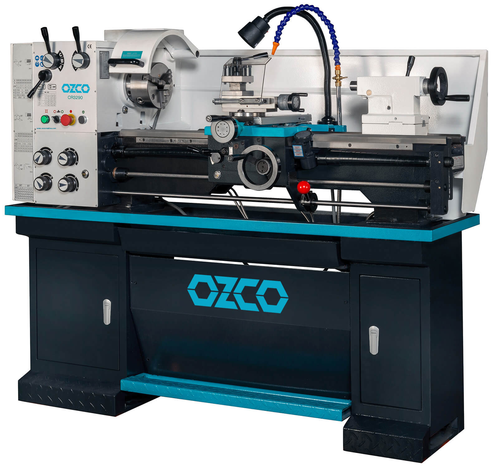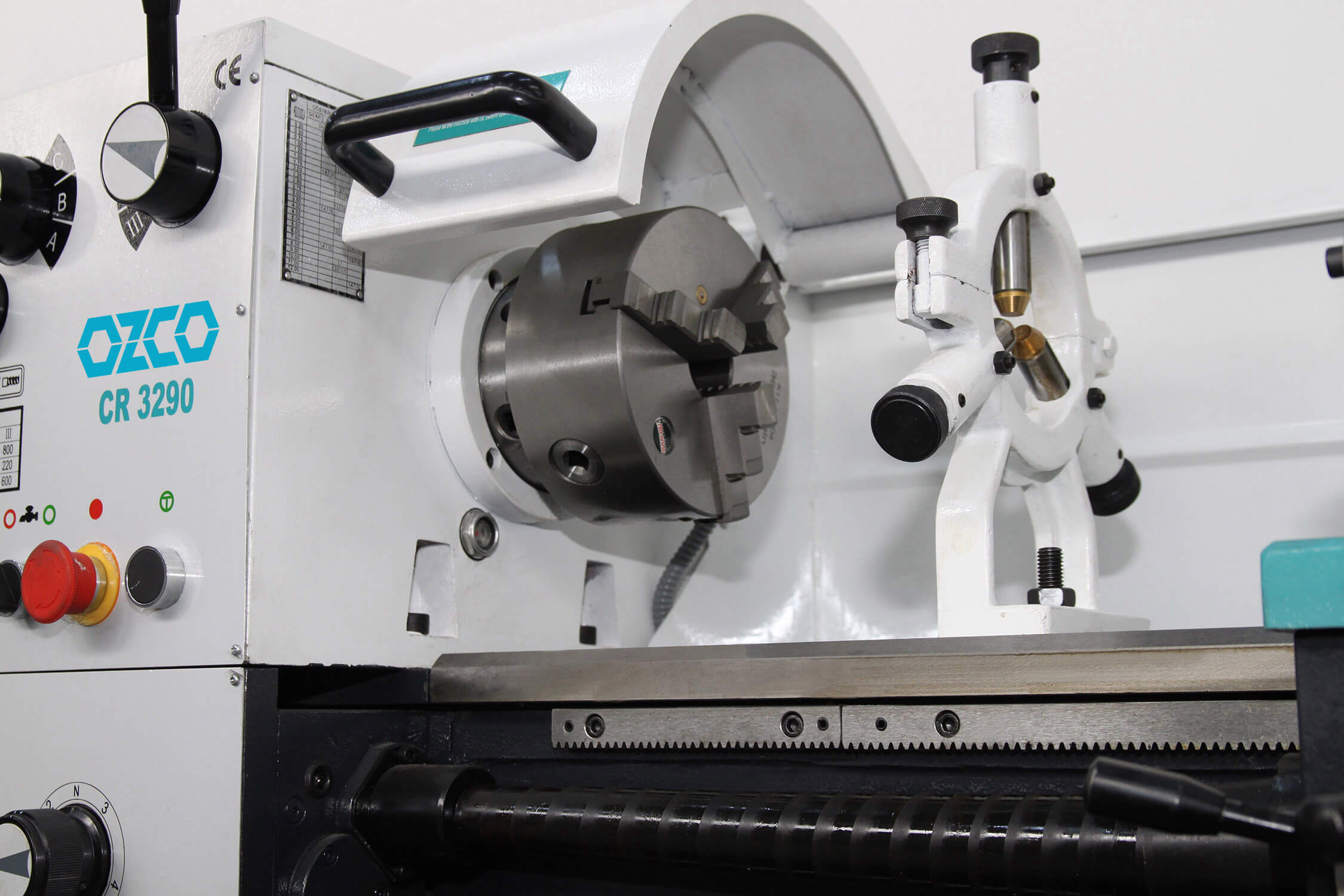 A safe lathe machine compliant with CE standards, equipped with a Siemens electrical system and cooling feature, a chuck guard with safety switch, and an emergency stop button. It is delivered with hardened beds, chuck, fixed and live centers, thread dial indicator, halogen lamp, and tool kit. Optional parts are available.