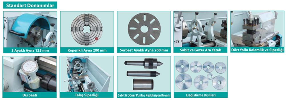 3-legged mirror, Shutter mirror, Freestanding mirror, Fixed and movable intermediate bed, Four-way pencil holder and shield, Dental clock, Chip shield, Fixed & rotating arbor/reduction sleeve, Replacement gears.