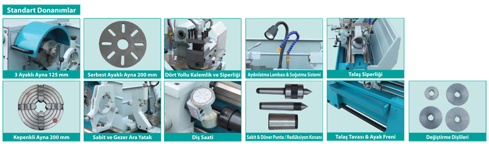 3-jaw chuck, independent chuck, four-way tool post with guard, lighting system & cooling system, chip guard, face plate, fixed and traveling steady rest, gear indicator, fixed & revolving tailstock/reduction sleeve, chip tray & foot brake, spare gears