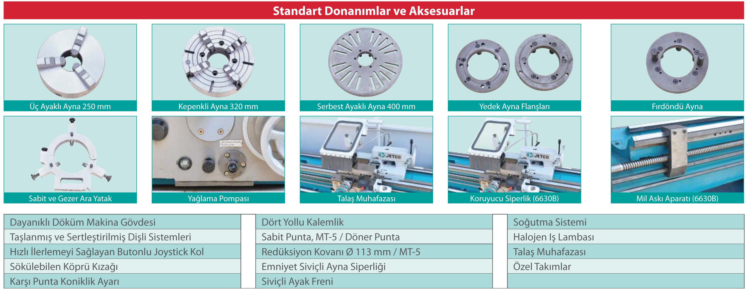 3-jaw chuck, face plate, independent chuck, revolving chuck, spare chuck flanges, traveling steady rest, fixed steady rest, lubrication pump, chip guard, fixed tailstock, 4-way tool post, chuck guard, cooling system, tailstock taper adjustment, spindle sleeve toolbox, foot brake pedal.